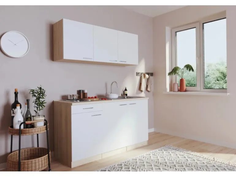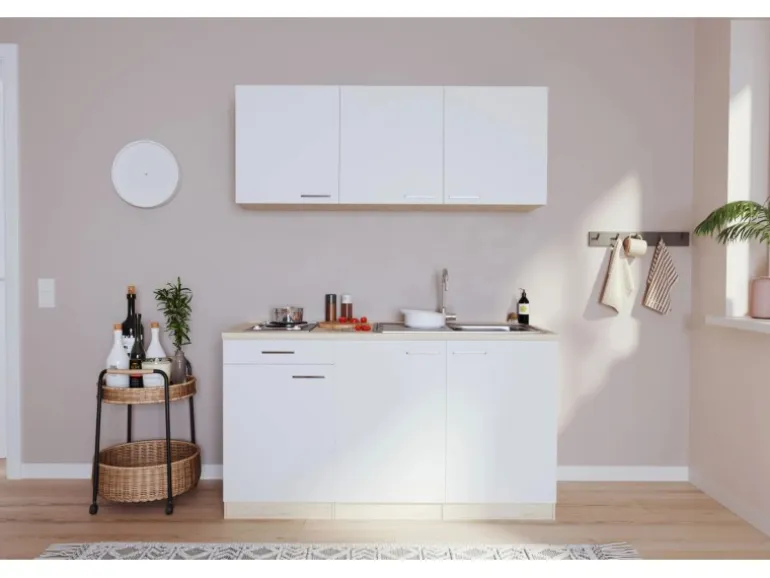 Mit einer Gesamtbreite von 150 cm ist die Küche ideal für das Büro, die Single- oder Studentenwohnung. Der Unterschrank mit Schublade und die drei Oberschränke bieten genügend Platz für Gläser und Geschirr.