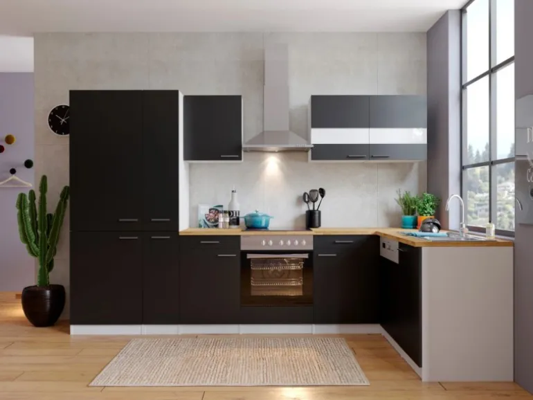 Ausgestattet ist die Küchenzeile mit Elektrogeräten wie Einbauherd, Dunstabzugshaube, Geschirrspüler und einer Kühl-/Gefrierkombination. Das Einbauherdset mit Glaskeramikkochfeld sorgt für größtmögliches Back- und Kochvergnügen. Die moderne Kopffreihaube bietet viel Bewegungsfreiraum und erleichtert den Zugriff auf die hinteren Kochstellen. Der integrierte Geschirrspüler erspart Ihnen lästiges Abwaschen per Hand. In der großen Kühl- und Gefrierkombination finden mühelos all Ihre Lebensmittel und Getränke Platz.