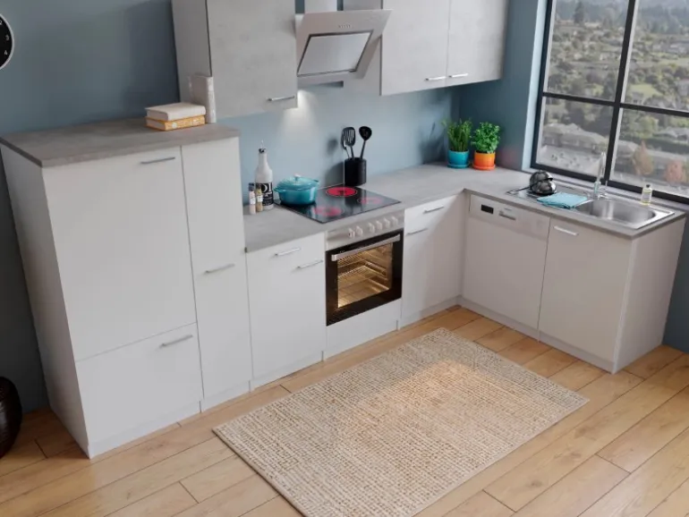 Fronten Weiß, Korpus Weiß, Arbeitsplatte und Oberschrankfronten Beton Optik