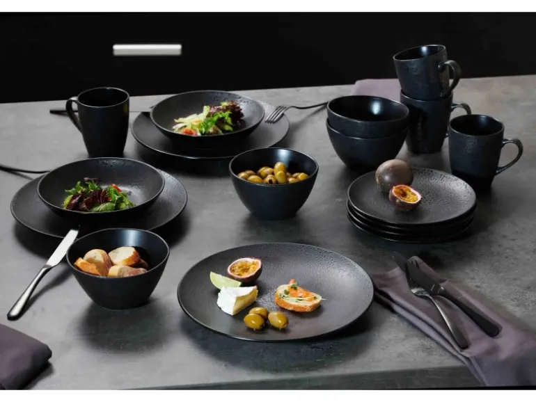 Smart & stylish: Beim kitwe Geschirr fasziniert die Kombination aus Flächen mit gemasertem und solchen mit glattem Finish. Die Maserung, die sich während des Brennvorgangs auf Basis einer sogenannten Reaktivglasur individuell entwickelt, macht jedes Geschirrteil zu einem Unikat. Dank der Coupeform und dem seidenmatten Farbton punktet kitwe ganz nebenbei als zeitgemäßes Gourmet-Geschirr.