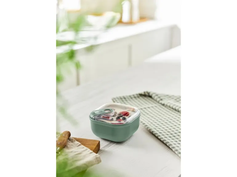 Die Transparenz des Deckels erlaubt es, den Inhalt zu sehen, ohne die Box öffnen zu müssen. Dank des schönen Designs der Box kann sie auch direkt auf dem Tisch als Schale verwendet werden. Zum Aufwärmen der Speisen kann die Box ohne Deckel in die Mikrowelle gestellt werden. Sowohl der Deckel als auch die Box sind für die Spülmaschine geeignet.