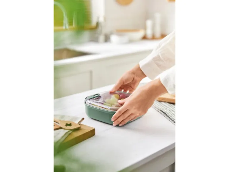Die Transparenz des Deckels erlaubt es, den Inhalt zu sehen, ohne die Box öffnen zu müssen. Dank des schönen Designs der Box kann sie auch direkt auf dem Tisch als Schale verwendet werden. Zum Aufwärmen der Speisen kann die Box ohne Deckel in die Mikrowelle gestellt werden. Sowohl der Deckel als auch die Box sind für die Spülmaschine geeignet.