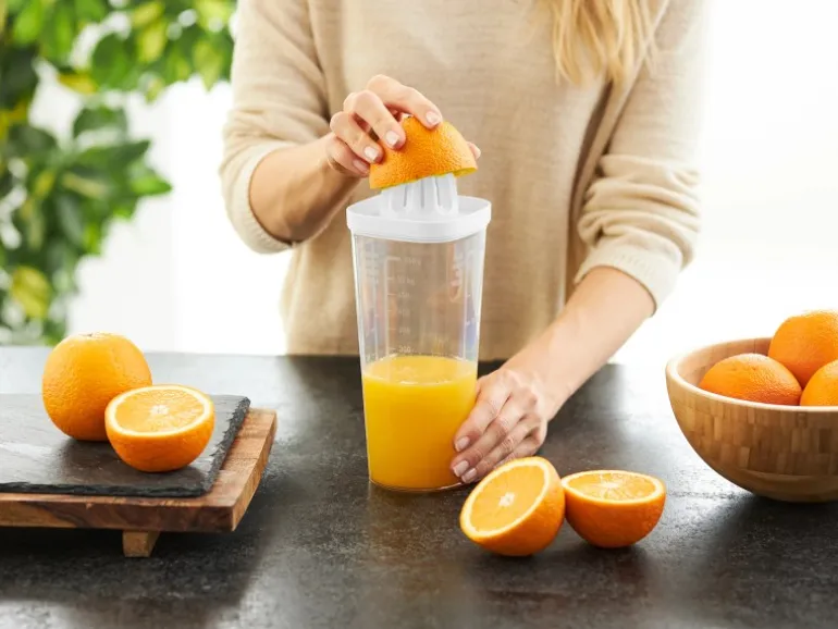 Gleichzeitig passt er ideal ins Seitenfach des Kühlschrankes, um Saucen, Säfte und vieles mehr kühl und sicher aufzubewahren. Dank der Zitruspresse können leckere Fruchtsäfte direkt im Becher zubereitet werden. Mit dem Mixaufsatz können Flüssigkeiten wunderbar sämig geschüttelt werden.