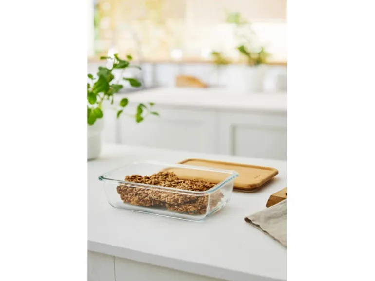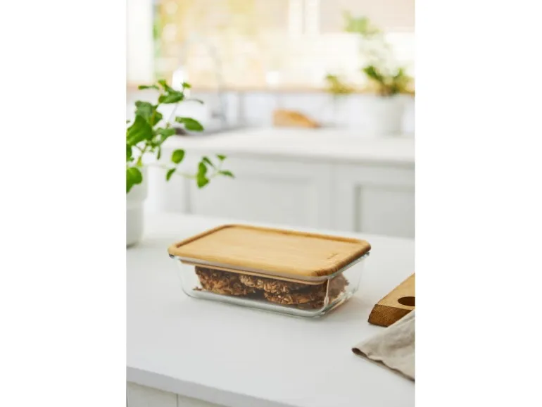 Der Behälter Nala aus Borosilikat-Glas von Rotho sieht nicht nur edel aus, er verfügt ausserdem über einen Temperaturanwendungsbereich von + 300 °C bis – 20 °C. Somit ist er backofenbeständig und kann aber auch zusammen mit dem Bambusdeckel zur Aufbewahrung von übrig gebliebenem Essen im Kühlschrank verwendet werden. Der Bambusdeckel bewahrt das Aroma und den Geschmack der Speisen und ist aus hochwertigem Bambus hergestellt.
