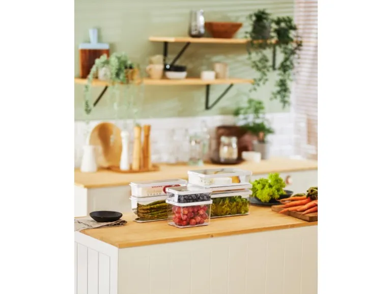 Der Einsatz mit den Löchern ermöglicht das Abfliessen von Flüssigkeiten, schützt die Lebensmittel und hält sie so länger frisch. Dank der hohen Transparenz des Unterteils hat man stets einen klaren Blick auf den Inhalt. Der wendbare Deckel kann dank des kleinen Griffes schnell geöffnet und geschlossen werden. Dreht man den Deckel um 180°, bietet er entweder mehr Platz im Container oder eine perfekte Stapelbarkeit. Das edle Design der Cauma Produkte erlaubt eine hübsche Präsentation auf dem Küchentresen oder dem Esstisch.
