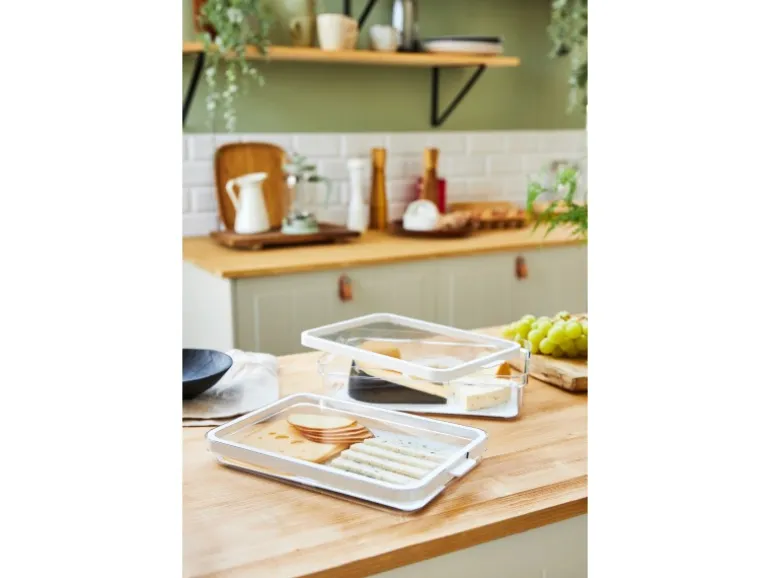 Der Einsatz mit den Löchern ermöglicht das Abfliessen von Flüssigkeiten, schützt die Lebensmittel und hält sie so länger frisch. Dank der hohen Transparenz des Unterteils hat man stets einen klaren Blick auf den Inhalt. Der wendbare Deckel kann dank des kleinen Griffes schnell geöffnet und geschlossen werden. Dreht man den Deckel um 180°, bietet er entweder mehr Platz im Container oder eine perfekte Stapelbarkeit. Das edle Design der Cauma Produkte erlaubt eine hübsche Präsentation auf dem Küchentresen oder dem Esstisch.