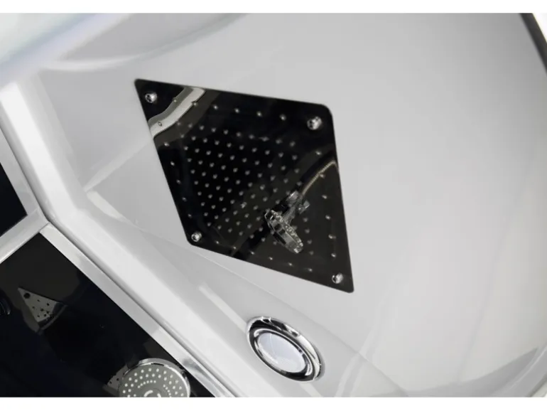Ebenso sorgt die Runddusche mit ihrer Edelstahl-Überkopfbrause, ihrer verstellbaren Handbrause sowie ihren großflächigen Massagedüsen für erholsame Entspannungsmomente. Ihr Design überzeugt durch eine 4 mm schwarze Rückwand, elegante Chromprofile, eine getönte Tür, ein getöntes Glasfixteil, eine Glasablage, Doppelrollen und durch ein schwarzes Glaspaneel mit integrierten Massagedüsen. Ebenso verfügt Sie über einen Einhebelmischer mit Umsteller und einem Touchscreen-Bedienelement.