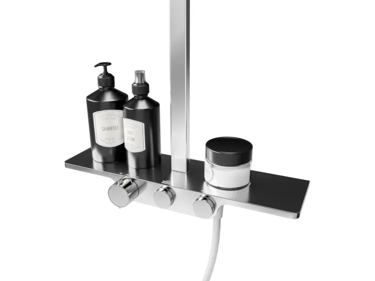 Die große, eckige Tellerkopfbrause simuliert eine angenehme Regendusche und lädt zum Entspannen ein, während die klassische Handbrause höhenverstellbar ist. Die Bedienung gelingt ganz einfach über Drücken oder Drehen der Elemente. Darüber hinaus bietet die praktische, integrierte Ablage ausreichend Platz für Ihre Dusch- und Pflegeprodukte, sodass Sie diese stets griffbereit haben. Der Korpus besteht aus Messing mit verchromter Oberfläche.