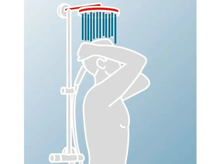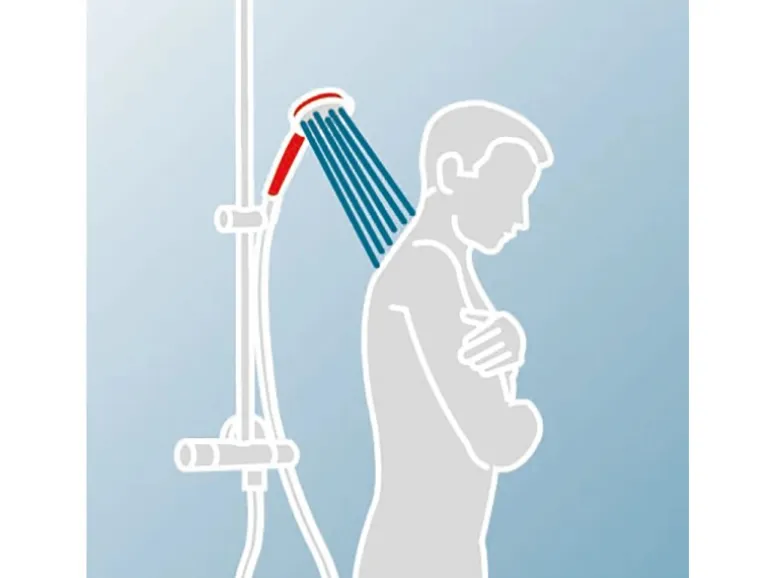 Modernes Duschsystem mit Ablage, Sicherheitsthermostat, Einhebelmischer und Umsteller zwischen Hand- und Tellerkopfbrause