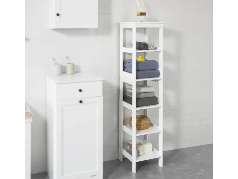 Dank dieser offenen Regale kannst du dein Badzubehör wie Kosmetika, Handtücher, Cremes, Flaschen und vieles mehr griffbereit aufbewahren.