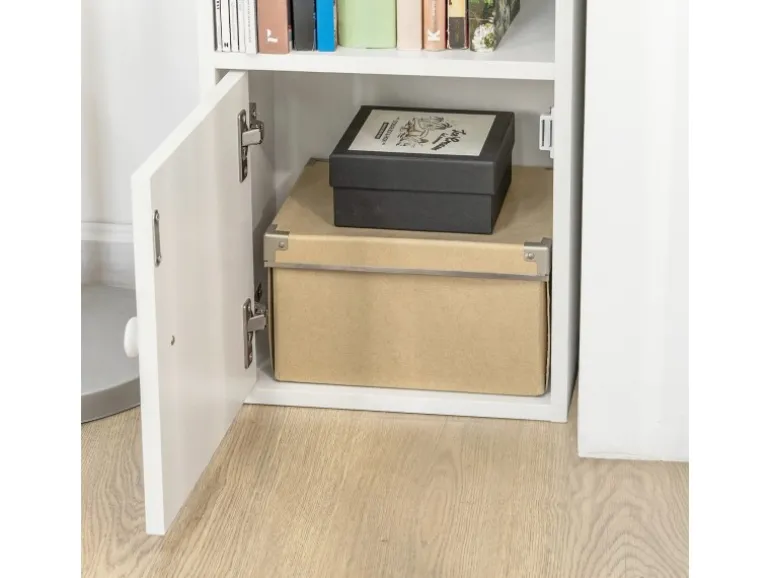 Das Bücherregal mit 3 Fächern, 2 Schubladen und 2 Türen bietet ausreichend Stauraum.