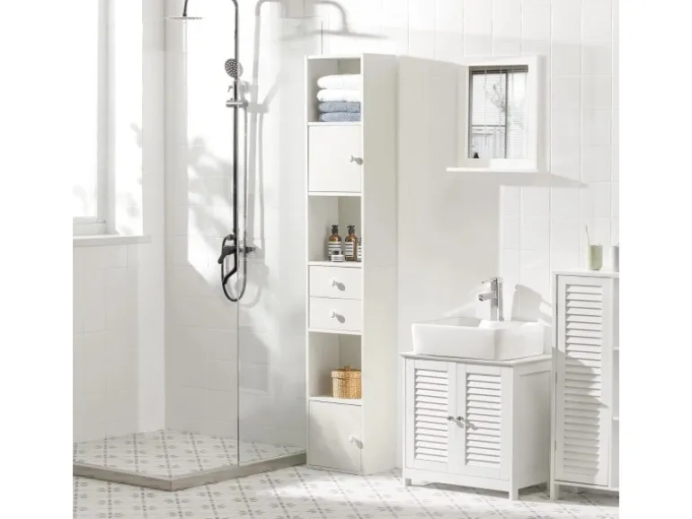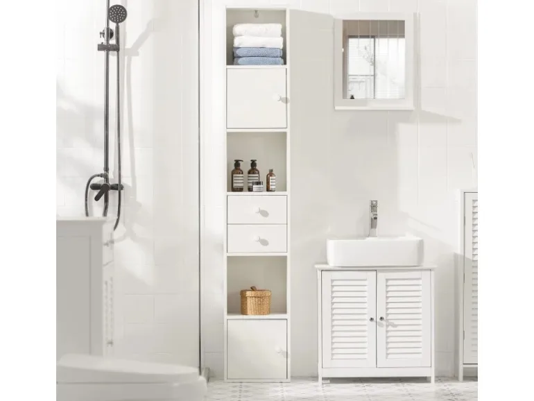 Dieses stilvolle ist ein idealer Ort, um Handtücher, Hygieneartikel, Pflegeprodukte wie beispielsweise Badeschaum und andere Haushaltsgegenstände aufzubewahren.