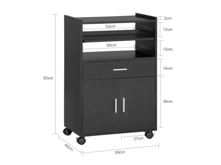 Der Wagen ist auch ideal als Drucker- und Getränkewagen oder als Aufbewahrungssystem für Aktenordner und Bücher im Büro.