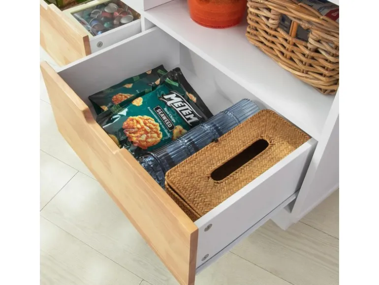 Dieser Küchenwagen verfügt über viele offene Fächer und zwei Schubladen, wo Sie viele Utensilien verstauen können.