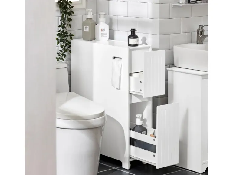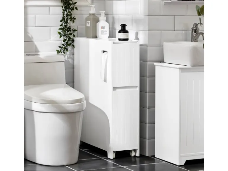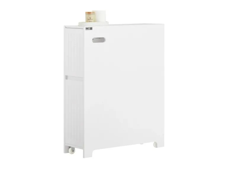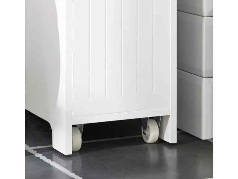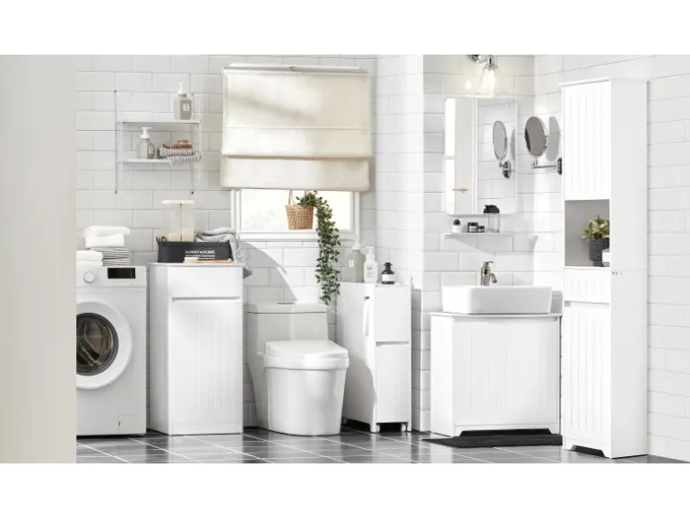Kann auch als 4-teiliges Set erworben werden: Hochschrank (BZR109-W), Toilettenrollenhalter (BZR111-W), Waschbeckenunterschrank (BZR108-W) und Wäscheschrank (BZR110-W).
