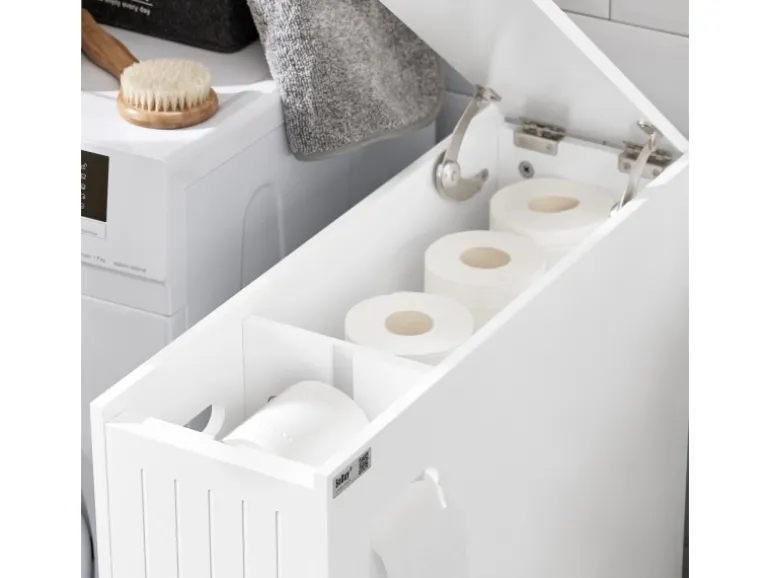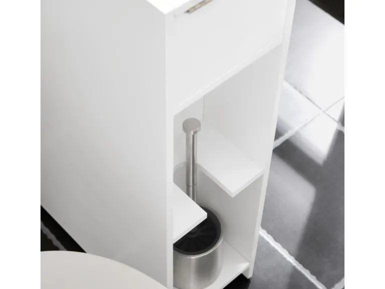 Das kleine Fach an der Rückseite des Schrankes ist für die Toilettenbürste vorgesehen.
