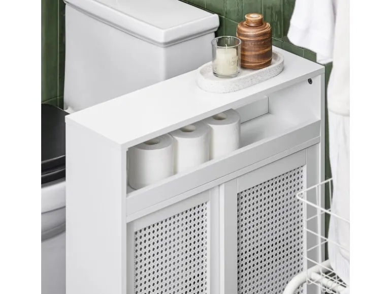 Ein offenes Fach und zwei Schiebetüren bieten eine Menge Stauraum für Ihre Gewürze, Badeutensilien, usw. Toilettenbürsten und Papierhandtücher haben eine eigene Aufbewahrung.