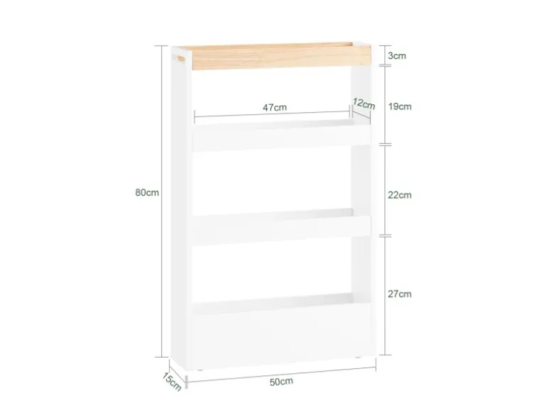 Die Breite von 15 cm ermöglicht es, dieses Regal flexibel überall dort zu platzieren, wo es benötigt wird, z.B.: in der Küche, im Wohnzimmer, oder im Bad. Sie brauchen nur eine Nische von der Länge einer Hand, um es zu verstauen, was Ihnen zusätzlichen Stauraum verschafft.