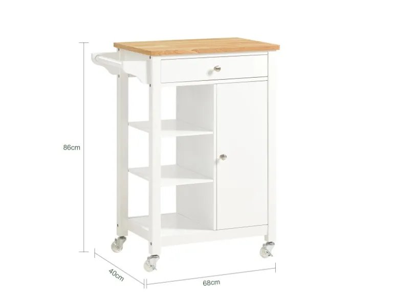 Der Küchenwagen hat vier stabile Rollen, auf denen sich der Küchenwagen leicht auf jeder Oberfläche verschieben lässt.