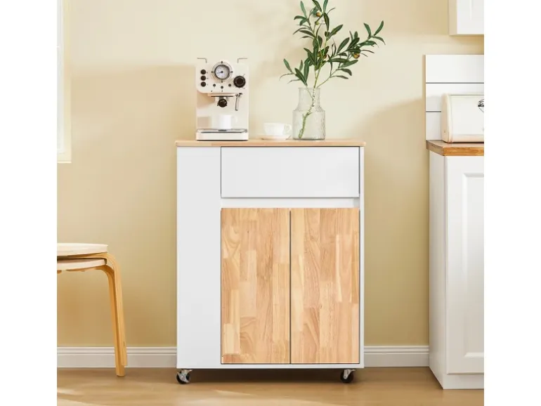 Hergestellt aus hochwertigem MDF und Gummibaum, bietet dieser Küchenwagen mit Rollen ein robustes Design mit einer Tragfähigkeit von 68 kg.