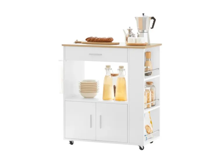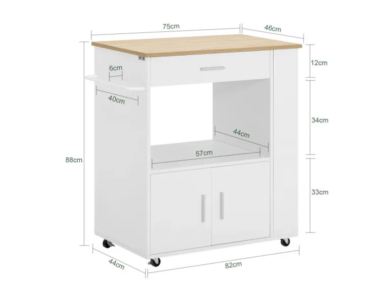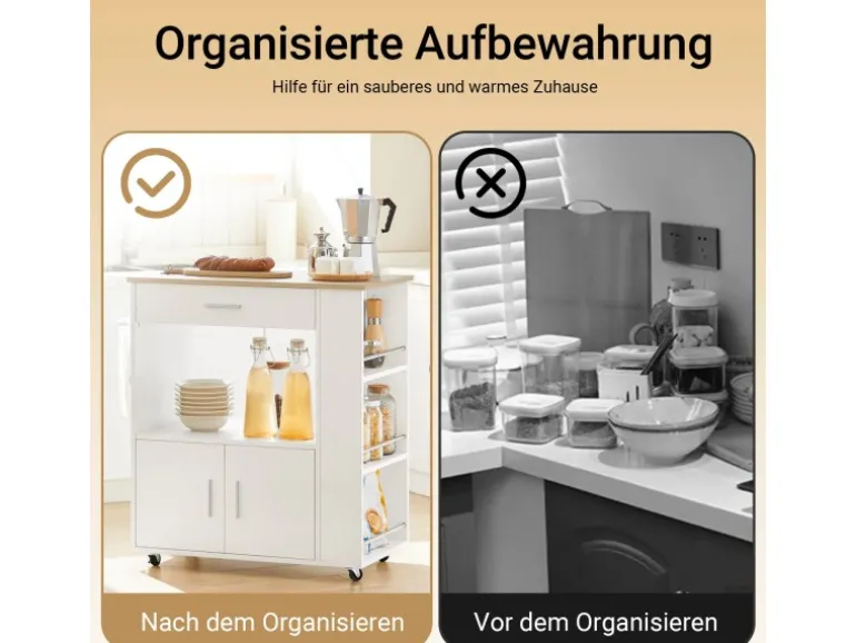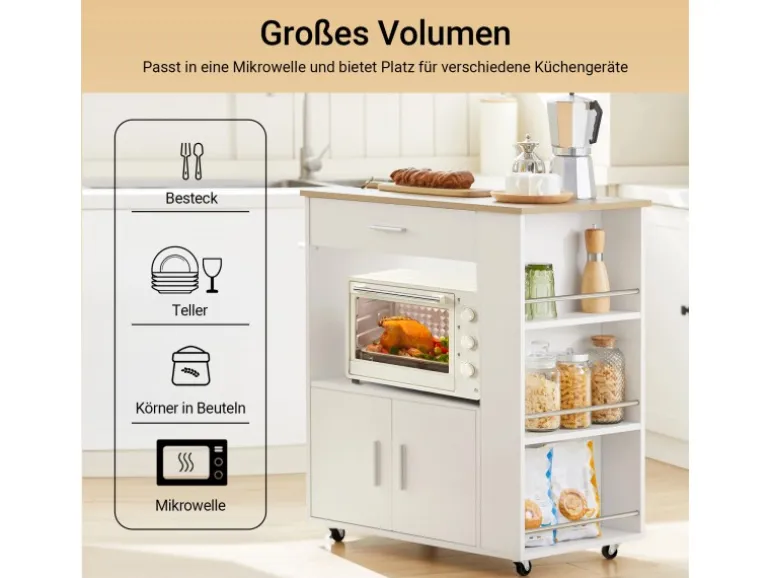 Dieser Servierwagen mit Rollen, auch als Küchenwagen mit Arbeitsplatte oder Rollwagen Küche, lässt sich flexibel als Beistelltisch, Kücheninsel mit Arbeitsplatte oder Mikrowellenwagen nutzen – ideal in Küche, Wohnzimmer oder Esszimmer.