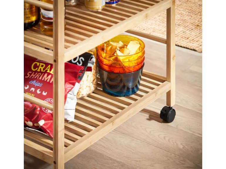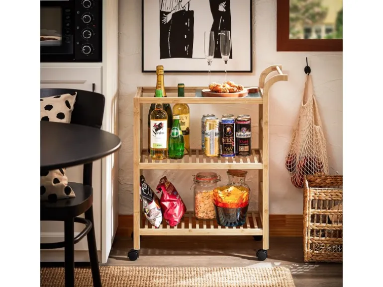 Dieser Küchenwagen aus Gummi-Holz ist stabil und bietet sehr viel Stauraum für verschiedenste Utensilien in Ihrer Küche.