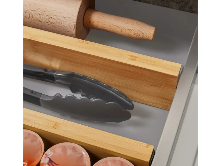 Jeder Schubladenteiler ist mit einem innovativen Federmechanismus ausgestattet, der dafür sorgt, dass der Teiler fest an Ort und Stelle bleibt. So wird ein Verrutschen effektiv verhindert.