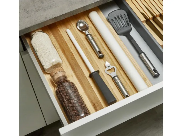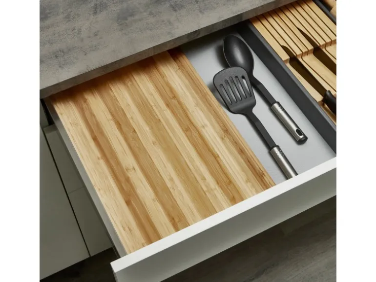 Verwandeln Sie Ihre Küchenschublade in einen organisierten und stilvollen Gewürzschrank mit diesem hochwertigen Gewürzeinsatz aus Bambus. Speziell für Schubladen mit einem Innenmaß von mindestens 473 x 310 mm entwickelt, bietet dieser Einsatz eine optimale Möglichkeit, Ihre Gewürzbehälter ordentlich und übersichtlich zu verstauen. Die ergonomisch gestalteten Rillen sorgen dafür, dass die Gläser sicher und geordnet liegen.