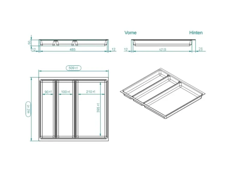 Tiefe 462 mm – Für Schubladentiefe von 500 mm / Höhe 45 mm / Materialstärke 2 mm