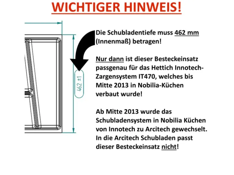 Die Serie ORGA-BOX II ist für eine Schubladentiefe von 500 mm ausgelegt. Passgenau für Hettich Innotech-Zargensystem IT470, welches bis Mitte 2013 von Nobilia eingesetzt wurde. Ab Mitte 2013 wurde das Schubladensystem in Nobilia Küchen von Innotech auf Arcitech gewechselt. In die Arcitech Schubladen passt dieser Besteckeinsatz nicht! Wichtiger Hinweis: Das Schubladeninnenmaß muss in der Höhe von 50 mm eine Breite von 509 mm aufweisen! Die Schublade muss 462 mm (Innenmaß) tief sein! Sollte Ihre Schublade nach Mitte 2013 gefertigt worden sein, passt dieser Einsatz nicht!