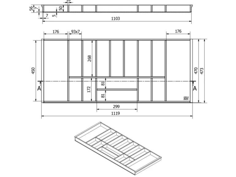 Die angegebenen Abmessungen/Maße Innenbreite 1119 mm / Innentiefe von 473 mm sind immer in der Höhe von 56 mm vom Schubkastenboden ausgemessen.