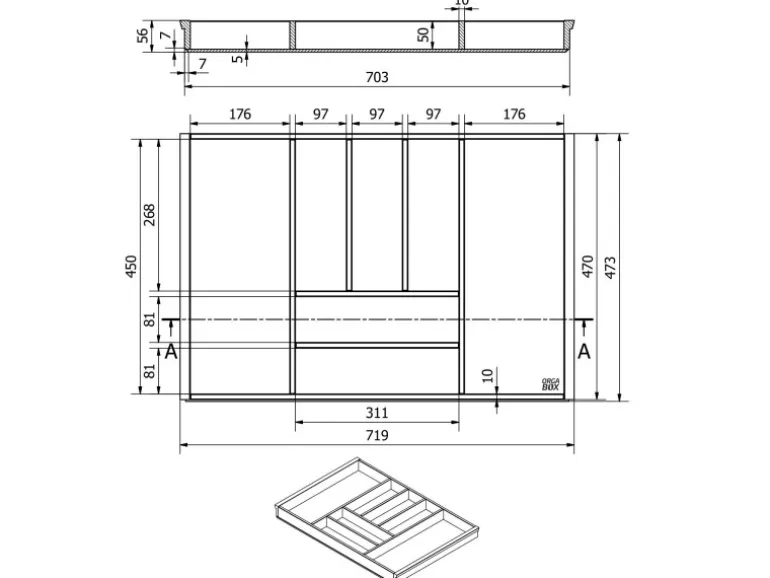 Die angegebenen Abmessungen/Maße Innenbreite 719 mm / Innentiefe von 473 mm sind immer in der Höhe von 56 mm vom Schubkastenboden ausgemessen.