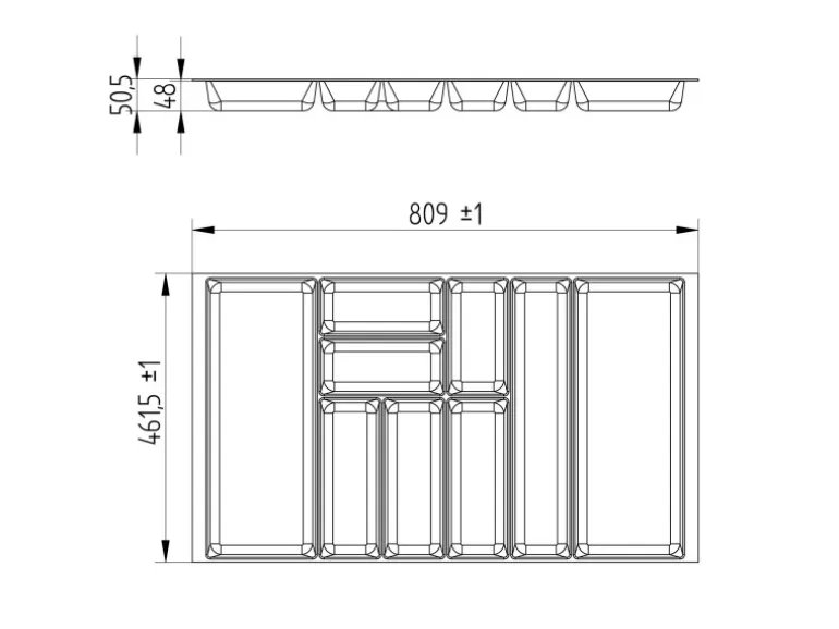 Das Innenmaß der Schublade muss in Höhe von 48 mm eine Breite 809 ± 1 mm betragen! Die Schublade muss eine Tiefe von 461 ± 1 mm (Innenmaß) haben.