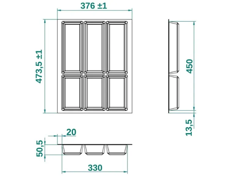 Tiefe 473,5 mm – Für Schubladentiefe von 500 mm / Höhe 53 mm / Materialstärke 2,5 mm