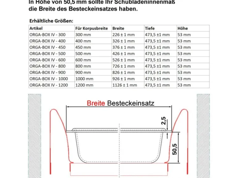 Die Serie ORGA-BOX IV ist für eine Schubladentiefe von 500 mm ausgelegt und passt mit einer Tiefe von 473,5 mm in fast alle Schubladen-Zargensysteme (Stand: 2015). WICHTIGER HINWEIS: Bei abgeschrägten Schubladenzargen wird die Schubladeinnenbreite in Höhe von 50,5 mm gemessen! Die Tiefe von 473,5 mm ist unter anderem passend (kein Zuschnitt nötig!) für folgende Küchenhersteller: Nobia, Schüller, Pronorm, Impuls, Beckermann, Brigitte, Alno, Pino.