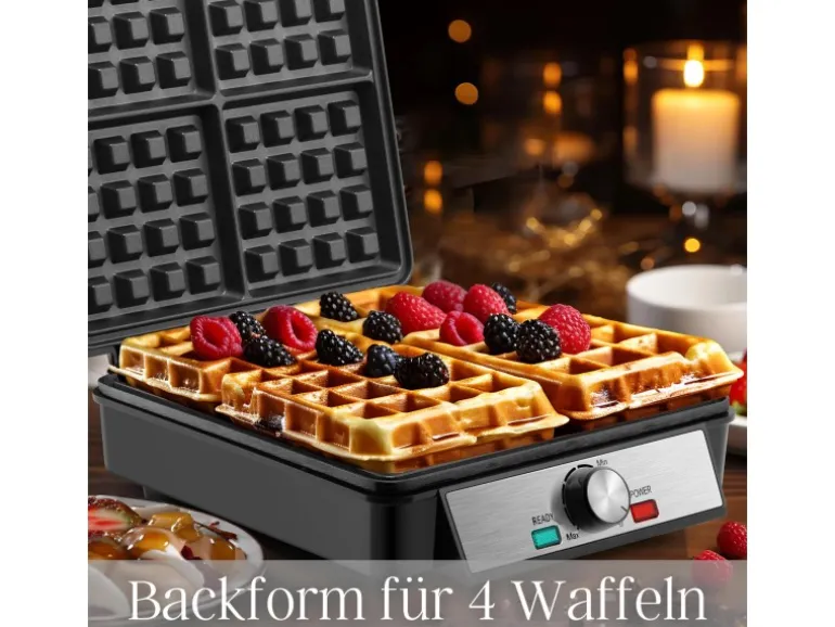 Mit der großzügigen Backform lassen sich vier gleichmäßig gebackene Waffeln gleichzeitig zubereiten – perfekt, wenn mehrere Portionen gewünscht sind.