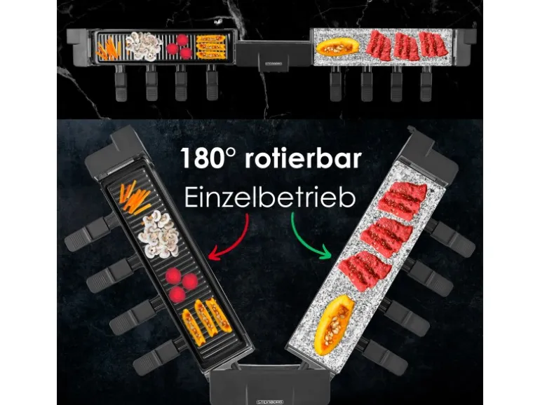 1.500 Watt LeistungMarmorplatte und Teflon beschichtete StahlplattePlatten separat betreibbar und 180° rotierbar8 antihaftbeschichtete Raclette-Pfannen100 cm fest integriertes NetzkabelPlatz für mehrere Personen
