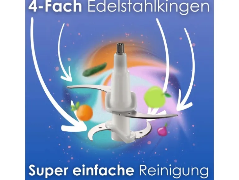 Klingen: Vier Edelstahlklingen (420er Stahl) für präzises Schneiden, Hacken und Mixen von Gemüse, Obst, Fleisch oder Nüssen.