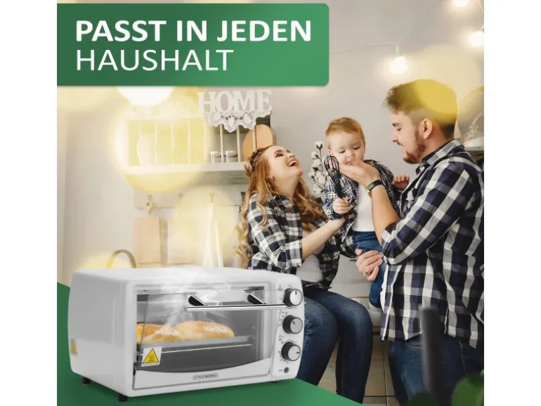 Kompaktes Design, einfache Bedienung, 1200 Watt und viele Extras wie Ober- und Unterhitze, eine stufenlose Temperatur-Einstellung und ein eingebauter 60-Minuten-Timer zeichnen den Ofen aus.