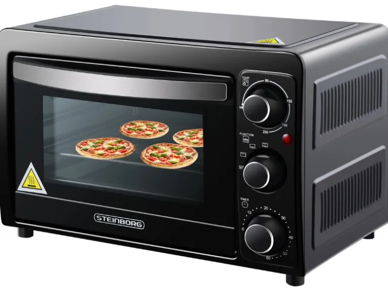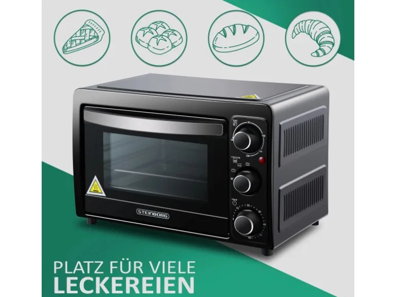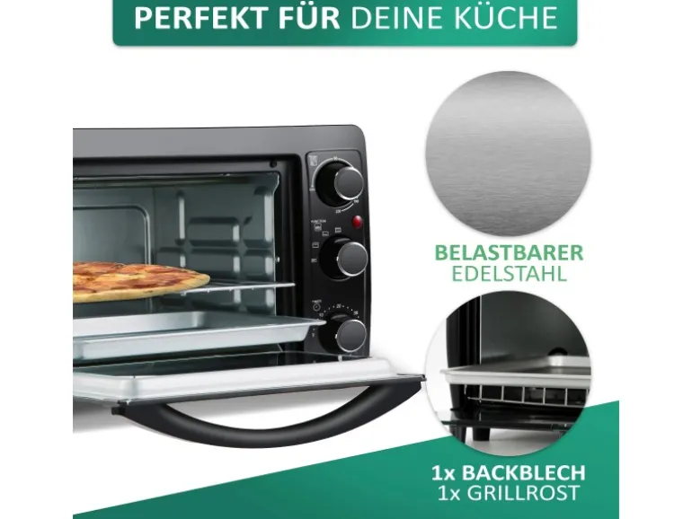 Kompaktes Design, einfache Bedienung, 1300 Watt und viele Extras wie Ober- und Unterhitze, eine stufenlose Temperatur-Einstellung und ein eingebauter 60 Minuten Timer zeichnen den Ofen aus.
