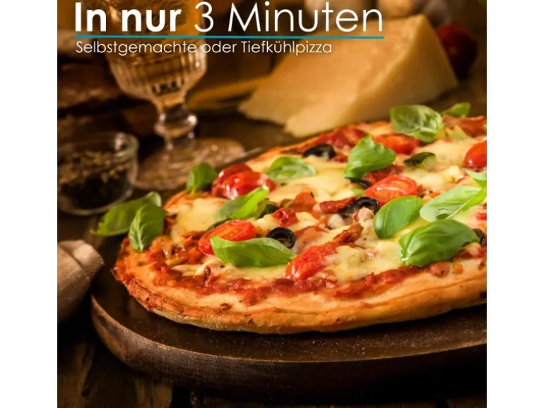 Backen Sie selbstgemachte oder Tiefkühlpizzen in nur 3 Minuten – ideal für alle, die Wert auf Geschwindigkeit und Qualität legen.