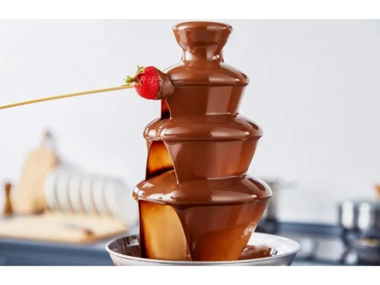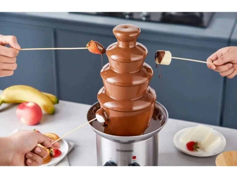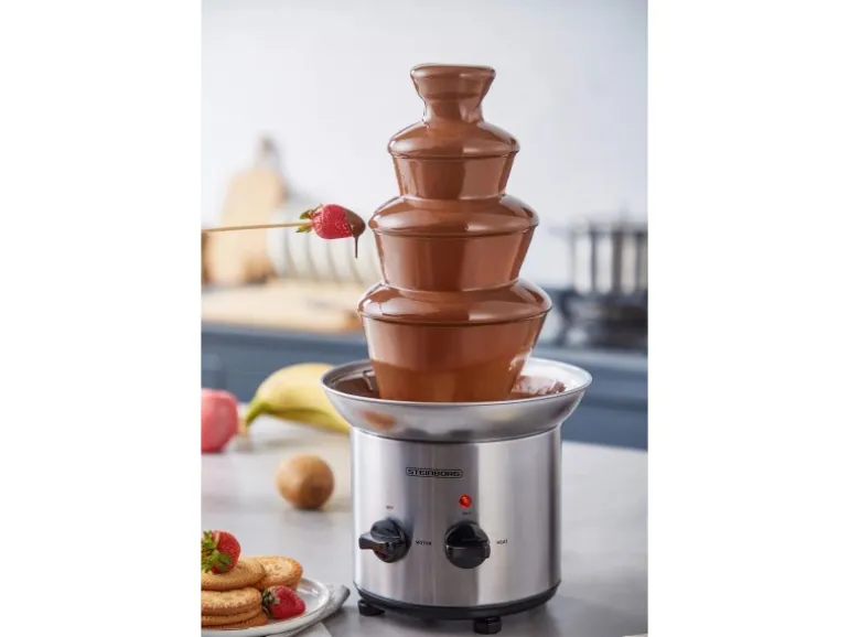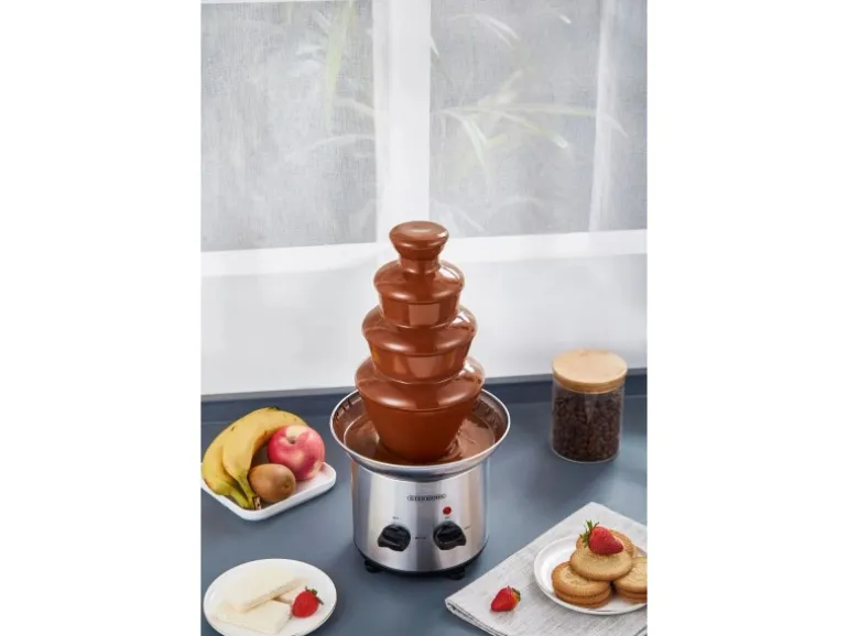 Highlights:Leistung: 190 WattKapazität: 1250 gHochwertiges und langlebiges Edelstahl4-Etagen-SystemZum dippen diverser Früchte/Gebäck, SüßigkeitenExtra glatte Kaskaden für verbesserte FließeigenschaftenBetriebszustandsanzeige über LämpchenHöhenverstellbare StandfüßeLeichte Reinigung (zerlegbar)Maße:21,5 x 21,5 x 44 cm (BxTxH)