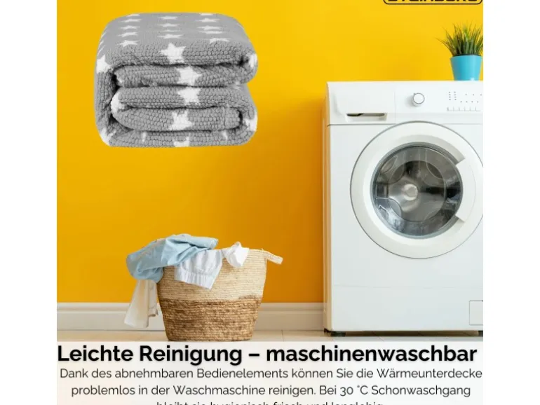 Die Decke ist maschinenwaschbar bei 30 °C. Dank des abnehmbaren Bedienelements lässt sie sich einfach reinigen und bleibt hygienisch frisch – ideal für den regelmäßigen Gebrauch.