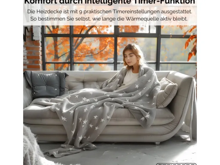 Die Heizdecke verfügt über 9 Timer-Einstellungen und schaltet sich nach Ablauf der gewählten Zeit automatisch ab. Ein integrierter Überhitzungsschutz sorgt für zusätzliche Sicherheit – ideal für entspannte Stunden oder zum Einschlafen.
