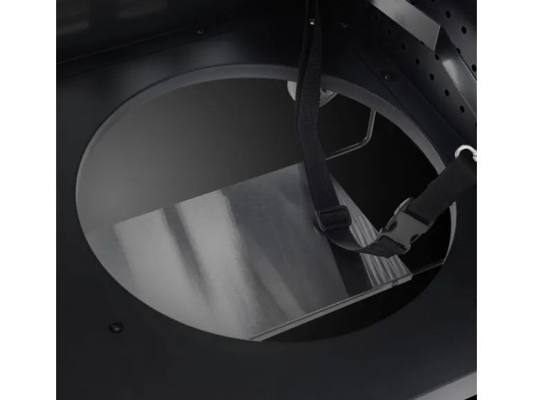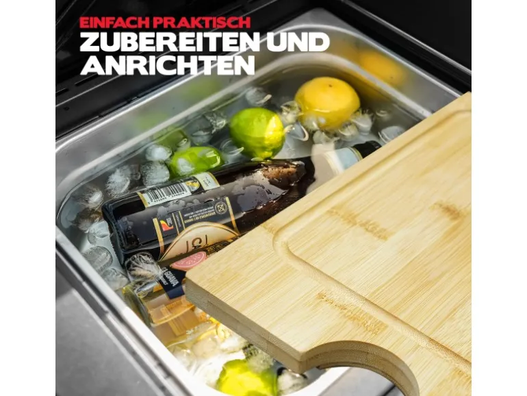 Ein Auffangbehälter mit Schneidebrett sowie ein Seitenbrenner (4 KW) ermöglichen das perfekte Steak