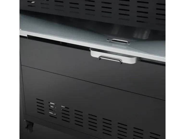 Der Unterschrank bietet viel Platz für diverse Grillutensilien und Gasflaschen mit einem Gewicht von bis zu 11kg, wobei vier feststellbare Rollen für die nötige Mobilität sorgen.Ein Flaschenöffner, ein integriertes Thermometer, eine Fettauffangschale und ein Warmhalterost machen als praktische Extras das Leben leichter.