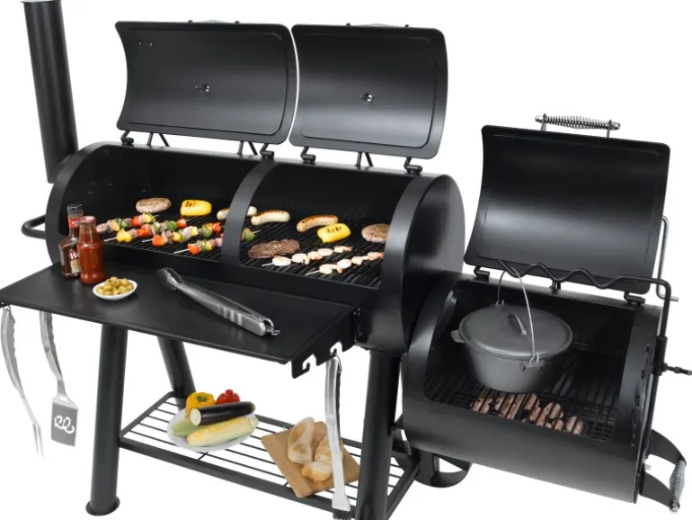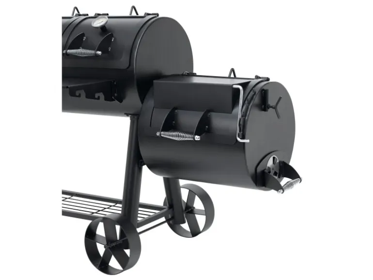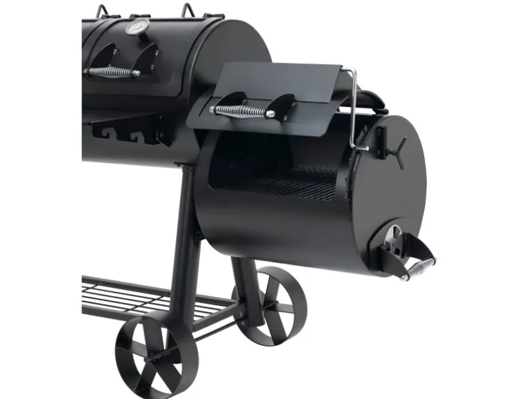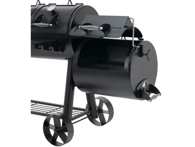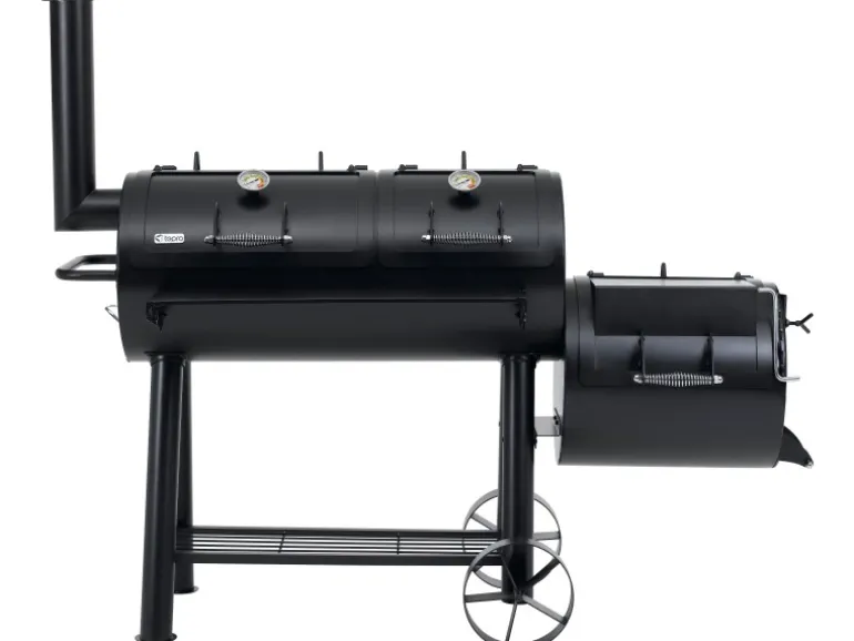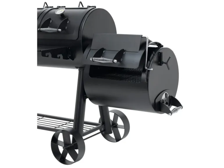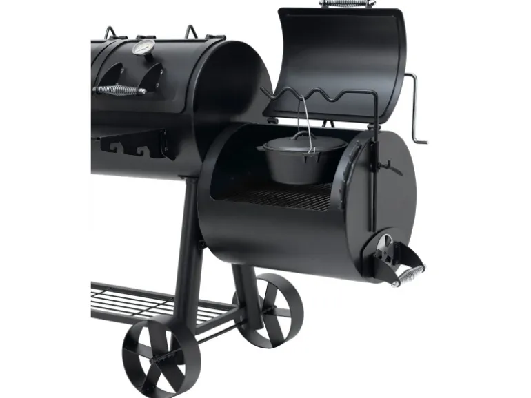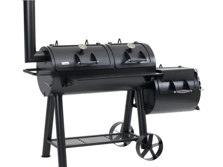 Der massive Tepro Smoker Indianapolis im Western Style verbindet verschiedene Grillmöglichkeiten. So kann zum einen das Grillgut traditionell auf der vorgesehenen Grillfläche direkt über der Glut zubereitet werden. Zum anderen kann das Fleisch auch in der Abluft eines Holzfeuers gegart werden. Dies ist durch die spezielle Bauform des Smokers möglich. Zusätzlich bietet er eine gesunde Art zu Grillen, denn durch die Zubereitung im Rauch können weder Fett noch Flüssigkeiten in die Flamme tropfen und gesundheitsschädliche Stoffe verursachen. Neben dem modernen Räuchern kann durch den 4-geteilten Grillrost in der Garkammer auch indirekt gegrillt werden. Die indirekte Grillmethode, bei der das Grillgut im geschlossenen Raum liegt und nicht direkt über der glühenden Kohle platziert ist, kann mit diesem Smoker einfach umgesetzt werden. Dieser Smoker mit einer Materialstärke von bis zu 5 mm ist besonders robust in seiner starken Ausführung. Hier wurde an alles gedacht, was das Smoker-Herz höher schlagen lässt. So beinhaltet dieser Grill 2 Deckel mit integrierten Thermometern für ein bequemes Beobachten der Temperatur in der großen Garkammer. Auch bei der kleinen Garkammer wurde an alles gedacht, denn der Deckelhalter lässt sich im Handumdrehen auf die gewünschte Position stellen, so dass die Luftzirkulation eingestellt ist. Die Deckelform der kleinen Garkammer ist so gefertigt, dass sie im geschlossenen Zustand als Kochfeld für einen Topf verwendet werden kann. Durch die vorhandenen Räder kann dieser schnell überall im Garten oder auf der Terrasse zum Einsatz gebracht werden.