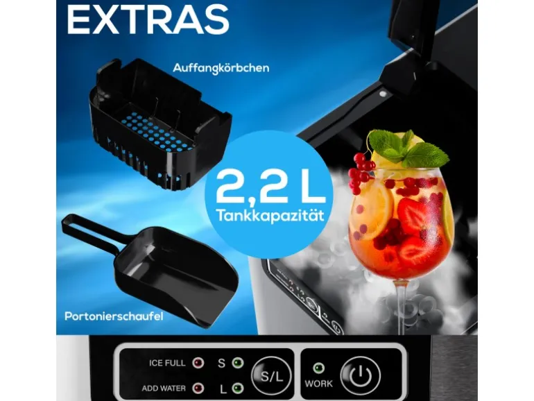 Ob Sie leidenschaftlicher Gastgeber sind oder einfach sicherstellen möchten, dass Ihre Getränke immer perfekt gekühlt sind – diese Eiswürfelmaschine ist Ihr unverzichtbarer Begleiter. Beeindrucken Sie Ihre Gäste mit perfekt gekühlten Getränken und genießen Sie den Komfort modernster Technologie.