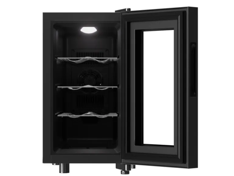 Perfekte Lagerung für Ihre Weinsammlung: Der ideale WeinkühlschrankOb leidenschaftlicher Weinliebhaber oder Genießer besonderer Momente – die richtige Lagerung macht den Unterschied. Mit unserem modernen Weinkühlschrank bewahren Sie Ihre edlen Tropfen stets optimal temperiert und stilvoll auf.Ein guter Wein entfaltet seinen Charakter nur unter den besten Bedingungen. Dank präziser Temperatursteuerung können Sie nun für weißen, roten oder prickelnden Wein die perfekte Lager- oder Serviertemperatur zwischen 5 und 18°C einstellen.Die doppelte Verglasung bewahrt Ihre edlen Tropfen vor schädlichem Lichteinfall, während die vibrationsarme Lagerung dafür sorgt, dass die feinen Aromen des Weins ungestört reifen können. Zusätzlich garantiert die moderne Luftzirkulation im Inneren eine konstante Feuchtigkeit, wodurch Ihre Weinkorken geschützt bleiben und ein Austrocknen vermieden wird. (Thermoelektrische Kühlung)Dieser Weinkühlschrank ist nicht nur funktional, sondern auch ein optisches Highlight. Das elegante Gehäuse und die LED-Innenbeleuchtung präsentieren Ihre Weinsammlung auf stilvolle Weise. Die angeordneten Böden bieten Platz für bis zu 12 Flaschen und sind leicht ausziehbar, um den Zugriff zu erleichtern.Die Kombination aus modernster Technologie, durchdachtem Design und einfacher Bedienung ist für jeden etwas. Ob für die Lagerung wertvoller Jahrgangsweine oder für spontane Weinmomente: Dieser Weinkühlschrank ist die perfekte Ergänzung für Ihre Ausstattung.Dank der Lagerung unter idealen Bedingungen erleben Sie einen professionellen Weinkühlschrank, welcher Ihre Leidenschaft für Wein auf ein neues Niveau hebt!Nutzinhalt gesamt: 23 LiterLagerkapazität: 8 Flaschen (genormte Flaschen gemäß EUR-Lex)Lautstärke Betrieb: 35dB(D)Energieeffizienzklasse: EKlimaklassen:N (Normal): Umgebungstemperatur von +16 °C bis +32 °C (Wohntemperaturbereich)ST (Subtropen): Umgebungstemperatur von +16 °C bis +38 °CHöhe: ca. 46 cmBreite: ca. 26 cmTiefe: ca. 50 cmNennspannung: 220-240V~ 50HzDurchschnittlicher Energieverbrauch: 75 kWh/ JahrNettogewicht: ca. 10 kg