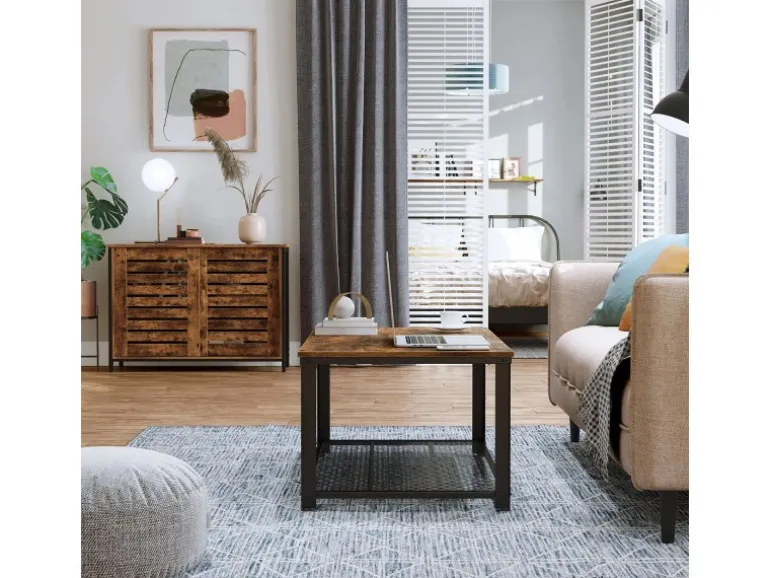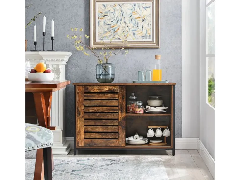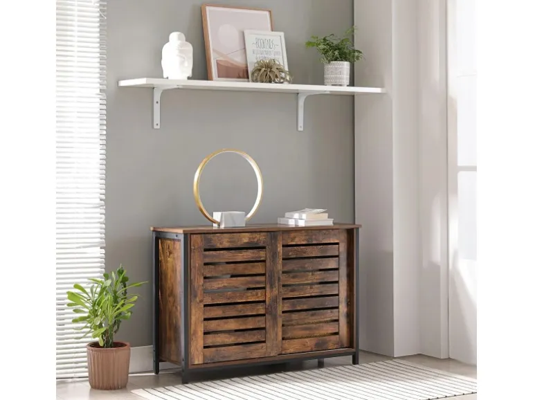 Schwarzer Stahlrahmen und rustikale braune Lamellentür